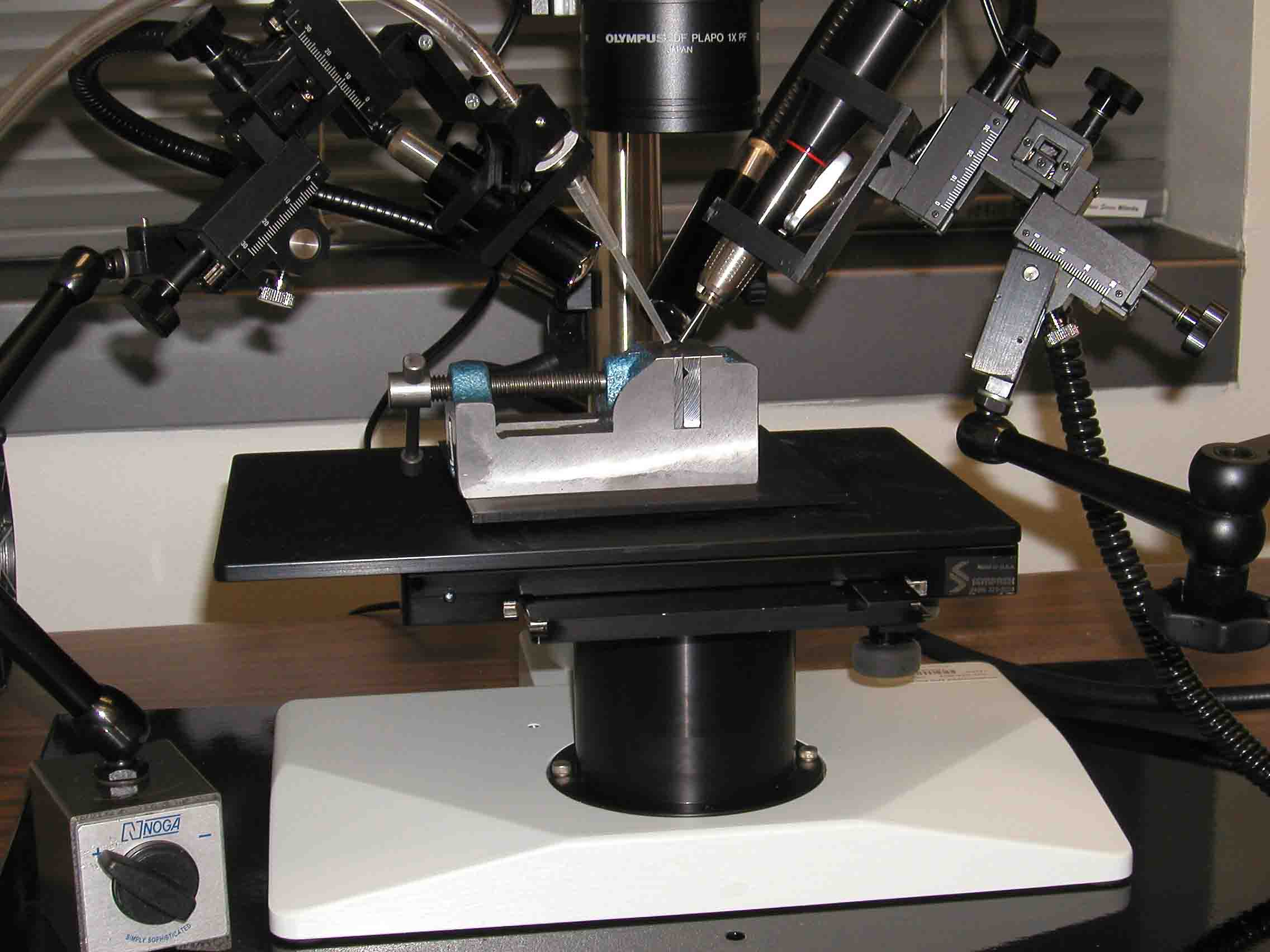 Microsampling apparatus in action, Texas A & M University. Closeup of the microdrill and micropipette on the stereo microscope. The sample is held in a small vise.