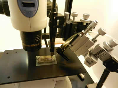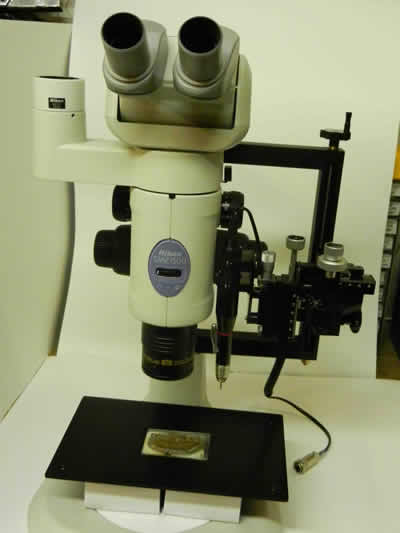 - Sample is transferred to stage of microdrilling apparatus stereo microscope.