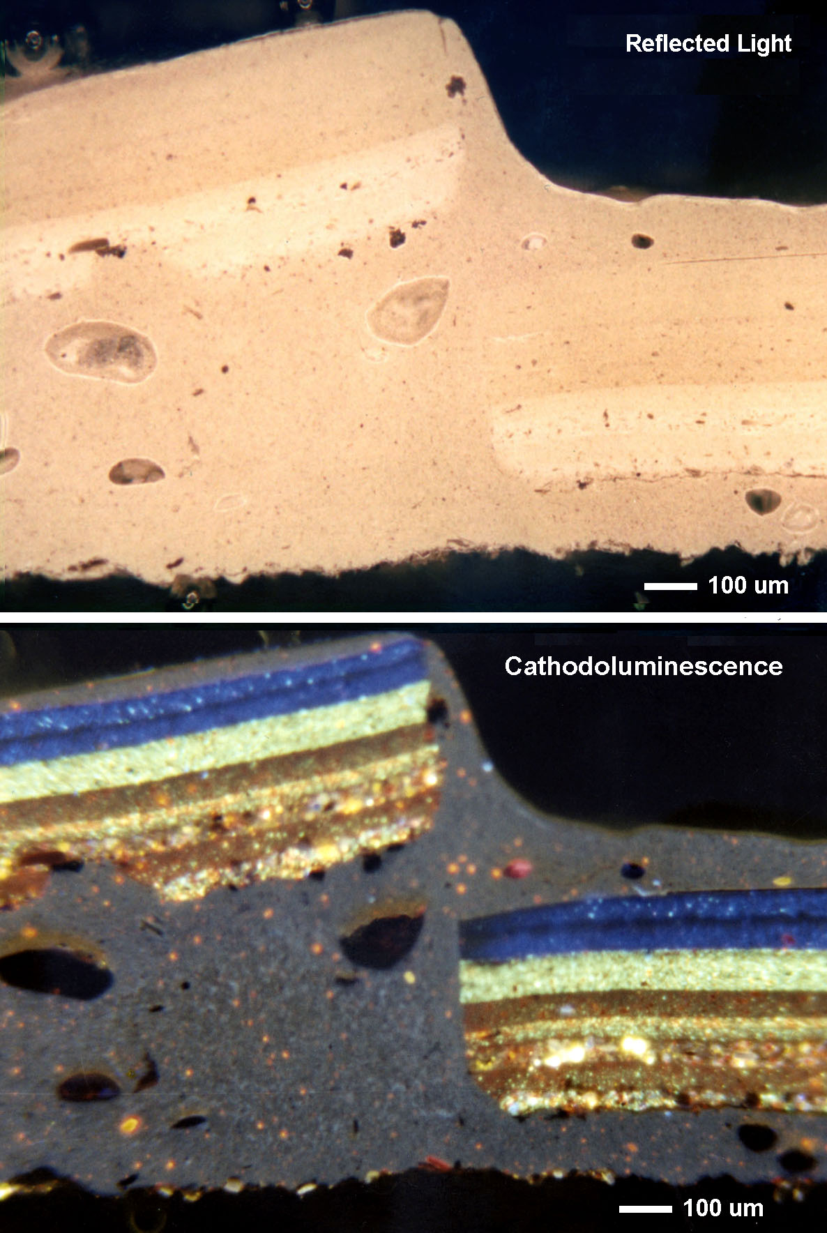 Sample of a paint layer from an automobile dent, shown in reflected light and by CL. Photo courtesy of Thom Hopen.