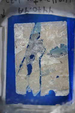 - Blue specks: These are small air bubbles that were trapped in a blue-dyed impregnating epoxy resin. The bubbles are now partly filled with aluminum oxide polishing paste — white in reflected light, but with blue CL luminescence.