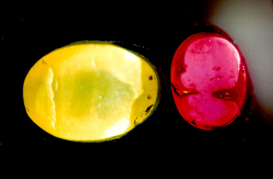 CL of two nearly opaque colorless cabochons: The red CL belongs to a 2.53 ct Geuda sapphire from Sri Lanka prior to its heat treatment, when its daylight color turns into a fine blue. The nearly egg-yolk CL color has to be attributed to manganese activator ions in a rare apatite cat's eye from the Austrian Alps (Museum for Natural History Vienna, No. M3894). Cond.excit.: 12 kV; 0.9 mA. Dr. Johann Ponahlo, Vienna.
